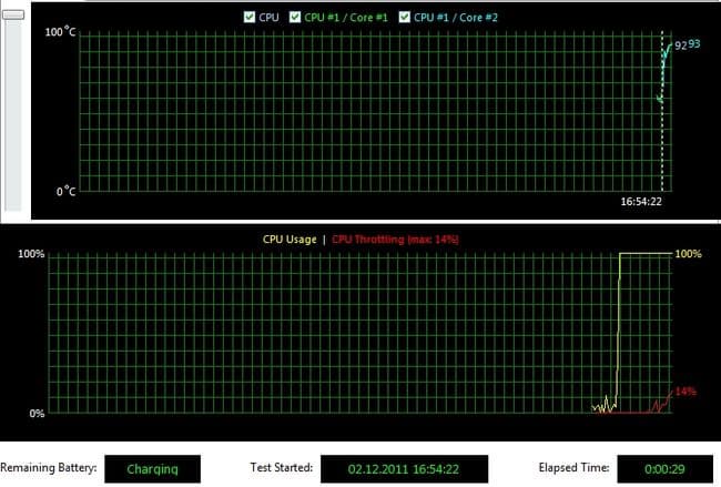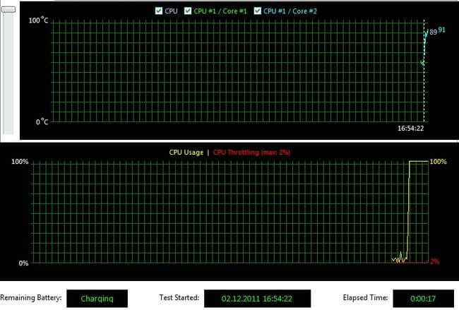 На 17-й секунде температура процессора переходит рубеж в 90 градусов и включается троттлинг.
