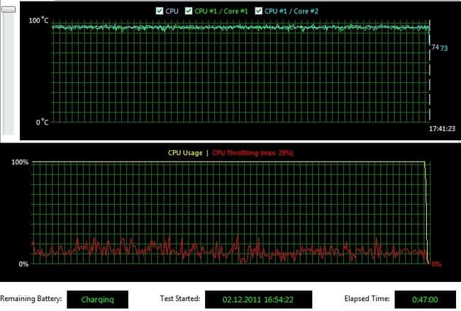 Кстати, при проведении нагрузочного теста через 35 минут после его начала экран моргнул, после чего сильно уменьшилась яркость, хотя в настройках она была выставлена на максимум. Яркость экрана восстановилась только после того, как ноутбук немного остыл.