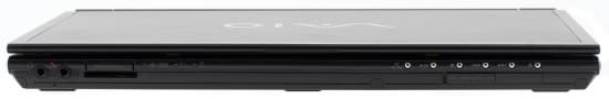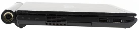 На левой грани расположены — порт для штекера питания, сетевой, модемный и FireWire-разъемы (они прикрыты специальной крышкой, ее надо отщелкнуть и выдвинуть вперед — она держится на гибком язычке). Далее идут решетки вентиляции, слот ExpressCard, два порта USB, порт замка Кенсингтона.
