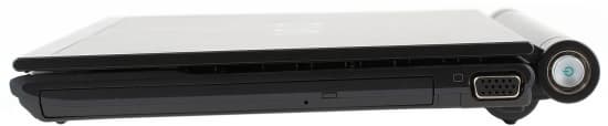 Практически весь правый бок занят лотком оптического привода, рядом с которым разместился выход на внешний монитор или проектор. Также тут видно прозрачную кнопку питания ноутбука.