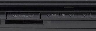 Системные индикаторы выполнены в виде маленьких светодиодов, утопленных в переднюю панель, сверху их не очень видно. Индикаторов всего три — индикатор работы картовода (рядом с ним стоит маркировка PRO), индикатор состояния батареи и индикатор обращения к жесткому диску. Индикатора работы нет: в этом ноутбуке им служит сама кнопка питания — при работе она горит зеленым светом, а в ждущем режиме — мигает красным. Оттенки цвета подобраны очень здорово, сама прозрачная кнопка выглядит красиво и стильно.