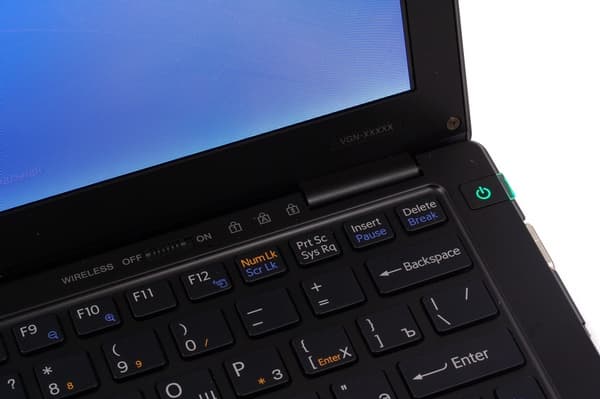 Индикатор работы у VAIO Х встроен в клавишу питания, при работе он горит зеленым светом, в ждущем режиме мигает красным, как на других ноутбуках Sony. Здесь применено интересное решение: горит зеленым символ включения (он направлен вверх) и полоска сбоку кнопки, которая выходит на боковую грань — по ней видно состояние ноутбука при закрытой крышке. Индикаторы состояния батареи, активности жесткого диска и беспроводных интерфейсов вынесены на переднюю панель, под тачпад. В принципе, если смотреть специально, их видно и при работе, но краем глаза не всегда замечаешь. Индикаторы клавиатурных модификаторов расположены над клавиатурой. Диоды во всех индикаторах слабые, их видно, если смотреть прямо на них, но они не отвлекают от работы даже в темноте. Если ноутбук включен в полутьме (например, при просмотре презентации или видеоролика), то ярко будет светиться только кнопка питания.