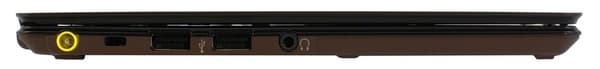 На левой грани расположен разъем питания (традиционно для разъемов Sony, он вызывает некоторые сомнения в прочности), порт замка Кенсингтона, два порта USB (для сверхпортативной модели — хороший показатель) и единственный аудиоразъем для наушников.
