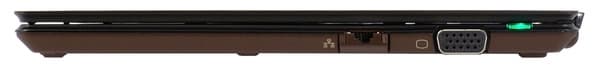 На правой грани расположен аналоговый выход на монитор VGA: инженеры Sony сочли, что именно он необходим в этой модели. Обратите внимание, что по толщине разъем — самое толстое место ноутбука, т.е. если подключить к нему обычный кабель с толстым разъемом, то, скорее всего, закрытый ноутбук не встанет на ножки, а будет лежать на этом разъеме. Рядом расположен разъем для проводной сети. Он закрыт крышкой, которая в открытом положении заодно фиксирует разъем.