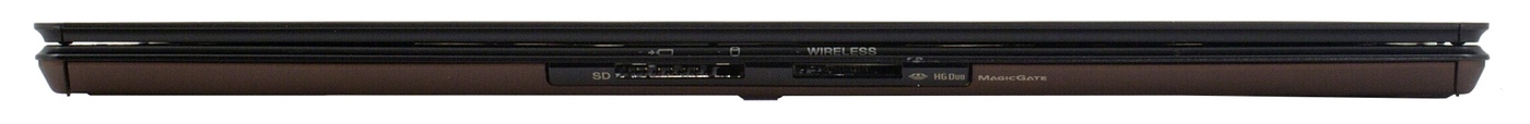 На левой грани расположен разъем питания (традиционно для разъемов Sony, он вызывает некоторые сомнения в прочности), порт замка Кенсингтона, два порта USB (для сверхпортативной модели хороший показатель) и единственный аудиоразъем для наушников.