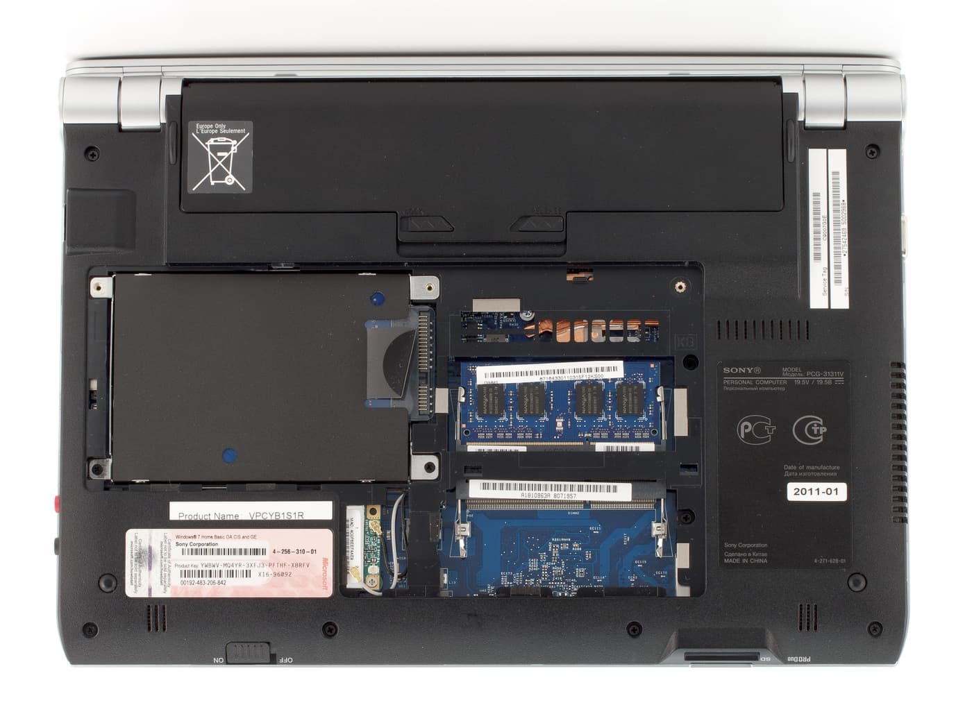 Снятый лючок на нижней части корпуса обеспечивает доступ к жесткому диску (в левой части фотографии — крышка его рамки) и двум слотам для оперативной памяти. Доступ к радиатору (например, для чистки вентиляции) здесь не получишь.