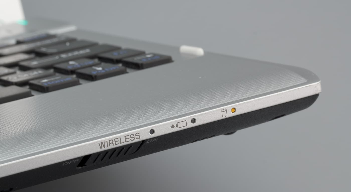 Индикаторы смотрят прямо вперед и диоды чуть утоплены в корпус, поэтому читаемость при работе с ноутбуком плохая. Под индикаторами расположен аппаратный выключатель беспроводных интерфейсов. Здесь он большой, его удобно найти на ощупь и переключить. Плюс, чтобы было точно понятно где он, на серебристой части написано Wireless.
