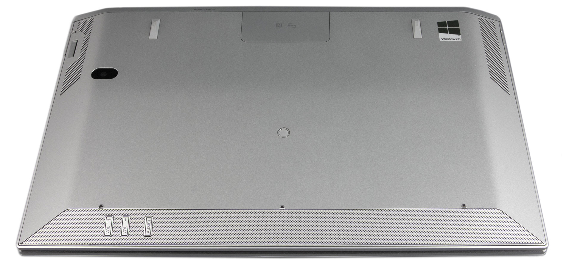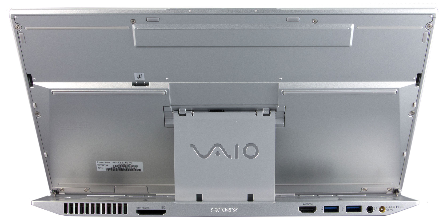 Нижняя часть корпуса Sony VAIO Duo 13 выполнена из серебристого пластика, армированного углеродным волокном. На нижней части корпуса расположены (по бокам) две вентиляционные решетки, тыловая камера и зона NFC-модуля.