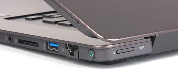 На правой грани ультрабука расположен еще один порт USB 3.0, слот SD-картовода, комбинированный аудиоразъем типа миниджек (наушники, микрофон), сетевая розетка RJ-45 и кнопка включения питания.