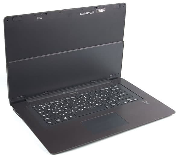 В режиме ультрабука экран и монтажная пластина представляют собой единую плоскость, причем экран пристегивается к монтажной пластине защелками и поворачивается вместе с ней относительно корпуса. Для фиксации экрана на монтажной пластине предназначен специальный переключатель с двумя положениями (Lock и Release), который расположен на шарнирном соединении крышки ультрабука с корпусом.