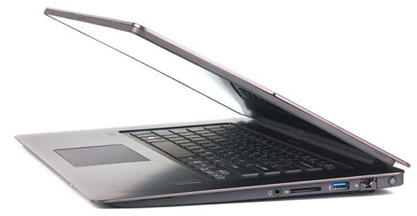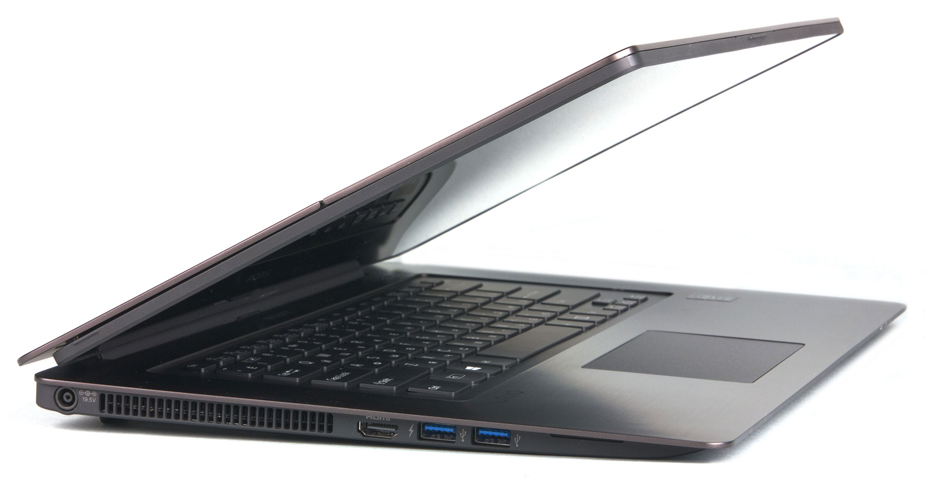 Теперь о разъемах, слотах и клавишах. На левой грани корпуса ультрабука расположены два порта USB 3.0, разъем HDMI, разъем питания и вентиляционная решетка. Отметим, что, согласно спецификации, максимальное разрешение внешнего монитора, подключаемого по интерфейсу HDMI, составляет всего 1920×1080 пикселей.