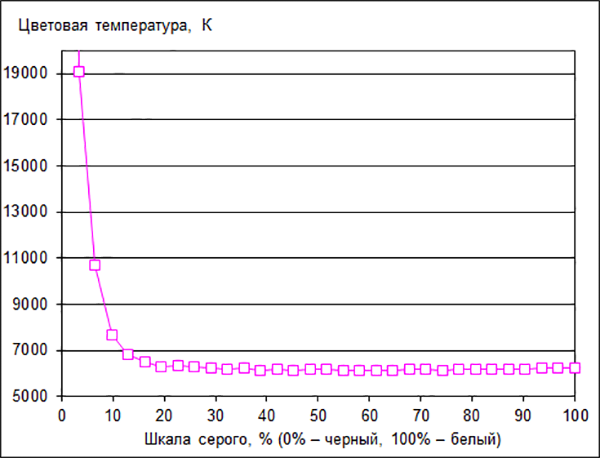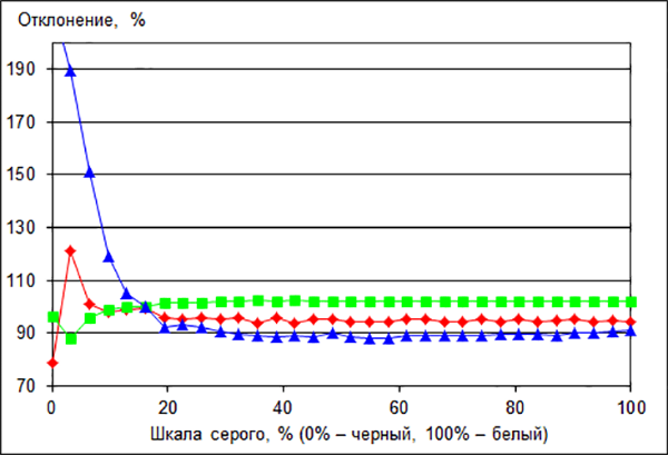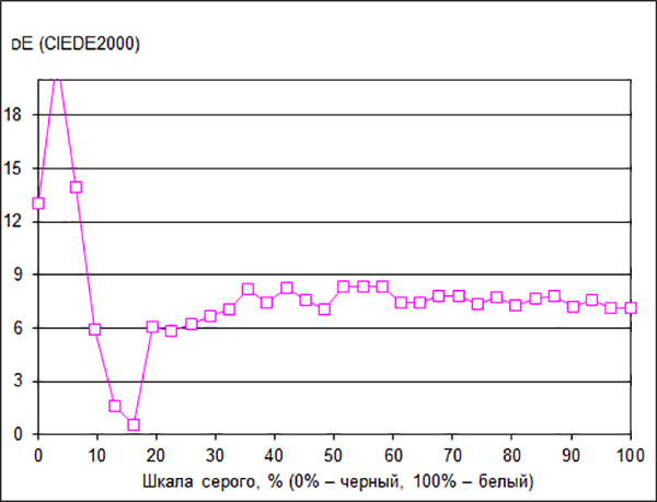 Что касается точности цветопередачи (дельта Е), то ее значение почти по всей шкале серого (за исключением темной области) колеблется между 6 и 9, что вполне допустимо для данного типа экранов.