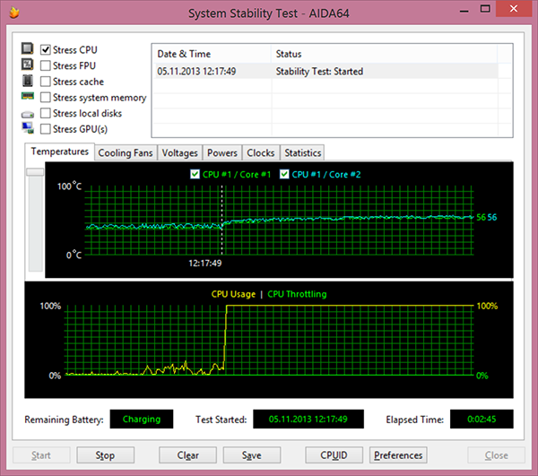 При загрузке процессора тестом Stress CPU (утилита AIDA64 Extreme Edition — тест на стабильность системы), который использует целочисленные вычисления, частота процессора составляет 2,3 ГГц (напомним, что для процессора Intel Core i5-4200U максимальная частота в режиме Intel Turbo Boost составляет 2,6 ГГц). Температура процессора в этом режиме загрузки не превосходит 56 °С.