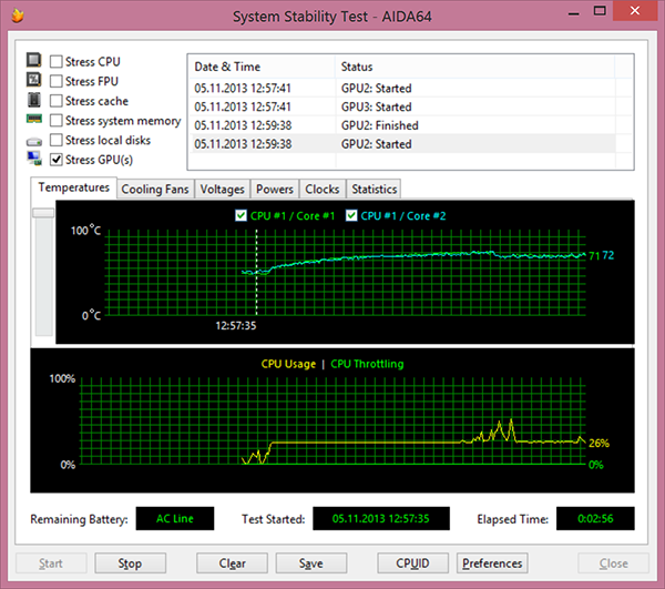 При загрузке графического ядра (Stress GPU) максимальная температура ядер процессора увеличивается до 72 °С. При этом частота ядер процессора составляет 2,3 ГГц (процессор загружается на 25%).