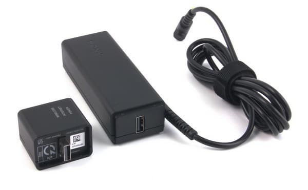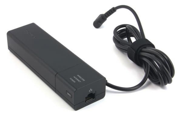 Прежде всего, это зарядное устройство (или адаптер питания) к этому ультрабуку. На торце зарядного устройства имеется разъемом USB, который может использоваться для зарядки различных мобильных гаджетов (напряжение 5 В, максимальный ток 1 А). Согласно нашим измерениям данный разъем USB обеспечивает напряжение 4,8 В при нагрузке в 1 А. Кроме того, в комплект поставки входит и миниатюрный беспроводной маршрутизатор Sony VGP-WAR100. Этот маршрутизатор с одного торца имеет коннектор USB (тип A), а с другого конца — разъем RJ-45. Маршрутизатор Sony VGP-WAR100 подключается к зарядному устройству ультрабука по USB-интерфейсу и в подключенном состоянии он как бы является продолжением зарядного устройства. Ну а разъем RJ-45 предназначен для подключения к сегменту локальной сети. Внутри маршрутизатора Sony VGP-WAR100 имеется модуль беспроводной связи с поддержкой протокола 802.11n. Собственно, такое решение предназначено для тех случаев, когда нет возможности подключить ультрабук к интернету по Wi-Fi напрямую, но зато есть возможность использовать проводное соединение. Фактически, такой маршрутизатор компенсирует отсутствие разъема RJ-45 на самом ультрабуке Sony VAIO Pro 13.