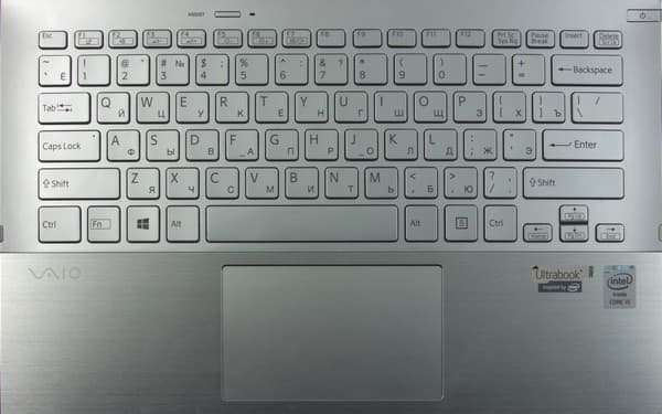 В ультрабуке Sony VAIO Pro 13 используется уже ставшая традиционной клавиатура островного типа с увеличенным расстоянием между клавишами. Основные клавиши на клавиатуре имеют стандартный размер 15×15 мм. Сами клавиши пластиковые и выкрашены в тот же серебристый цвет, что и поверхность, обрамляющая клавиатуру. Поверхность под клавиатурой имеет небольшое углубление, равное ходу клавиши.