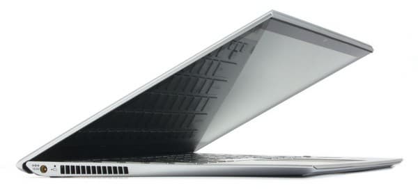 Отметим, что на корпусе ультрабука практически не остаются заметными отпечатки пальцев, и «заляпанным» этот ультрабук выглядеть никогда не будет. Габаритные размеры корпуса составляют 322×216×12,8—17,2 мм, а масса ультрабука всего 1,06 кг, то есть этот ультрабук действительно очень легкий и тонкий. Смотрится он весьма и весьма стильно, однако есть в этом конструктиве и свои недостатки, о которых мы расскажем далее.