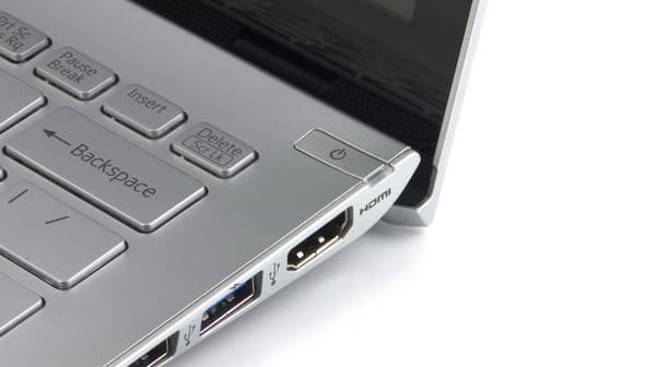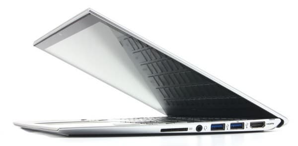Ну а теперь о разъемах. Почти все разъемы в этом ультрабуке расположены на правом торце корпуса. Их не так много: два порта USB 3.0, разъем HDMI, слот для карт памяти и комбинированный аудиоразъем типа миниджек (наушники, микрофон). Ну а на левом торце корпуса расположен лишь разъем для подключения адаптера питания.