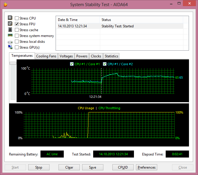 При загрузке процессора тестом Stress FPU, который использует вычисления c плавающей точкой и в большей степени нагревает процессор, первоначально частота процессора составляет 2,3 ГГц, но при его нагреве до 80 °С частота процессора уменьшается до 1,6 ГГц. При этом установившееся значение температуры ядер процессора составляет все те же 65-66 °С.