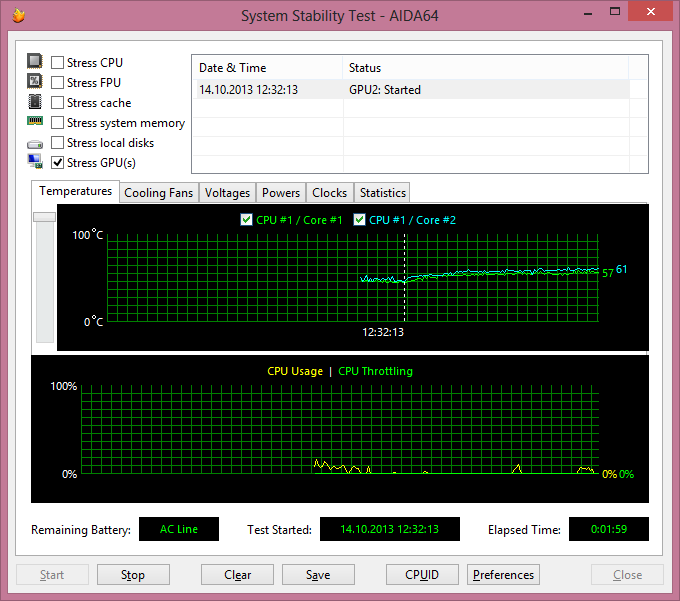 При загрузке графического ядра (Stress GPU) максимальная температура ядер процессора увеличивается до 61 °С. При этом частота ядер процессора составляет 800 МГц (процессор не нагружается).
