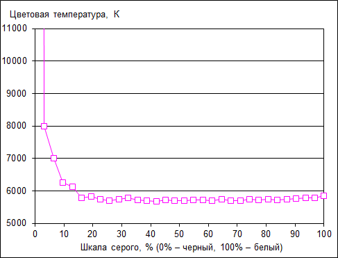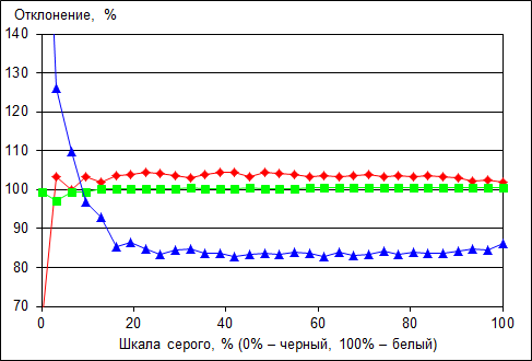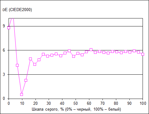 Что касается точности цветопередачи (дельта Е), то ее значение почти по всей шкале серого (за исключением темной области) не превосходит 6, что является хорошим результатом.