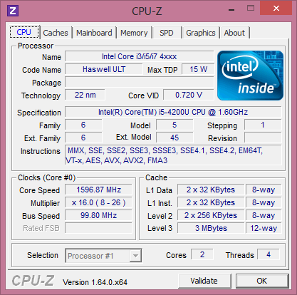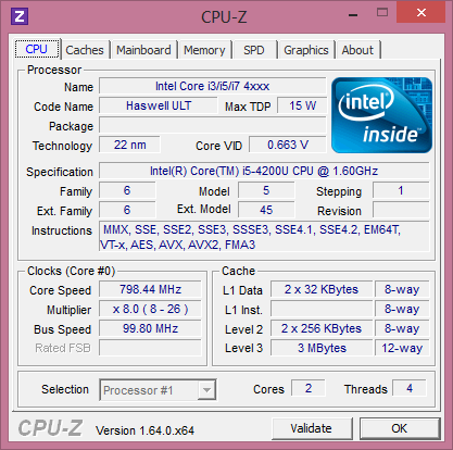 Итак, основой ультрабука Sony VAIO Pro 13 SVP1321M2RS является двухъядерный процессор Intel Core i5-4200U. Этот процессор с пониженным энергопотреблением (U-серия) имеет номинальную тактовую частоту 1,6 ГГц, которая в режиме Turbo Boost может повышаться до 2,6 ГГц. Размер кэша L3 составляет 3 МБ, а TDP этого процессора составляет всего 15 Вт. В процессор Intel Core i5-4200U интегрировано графическое ядро Intel HD Graphics 4400, базовая частота которого составляет 200 МГц, а частота в режиме Turbo Boost — 1 ГГц.