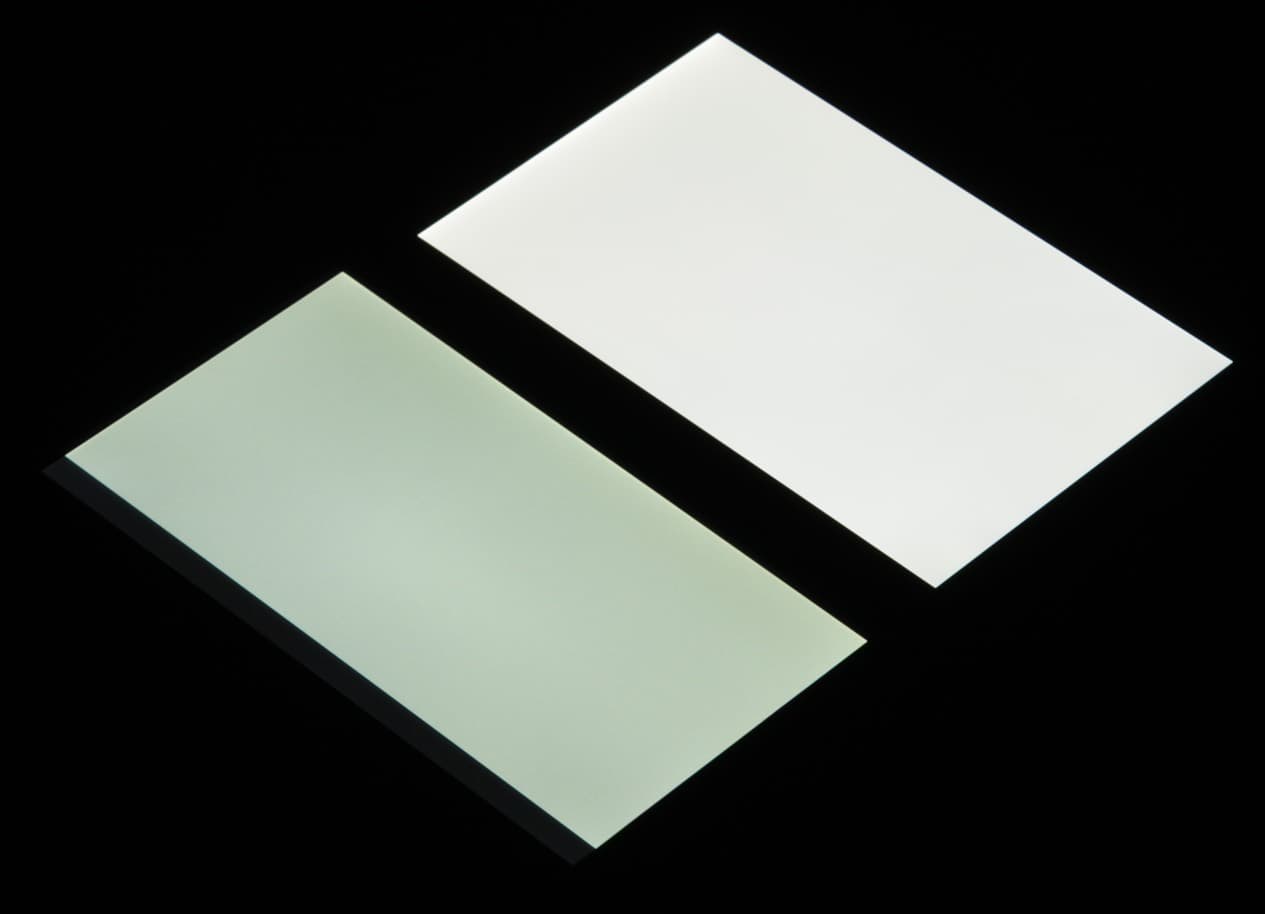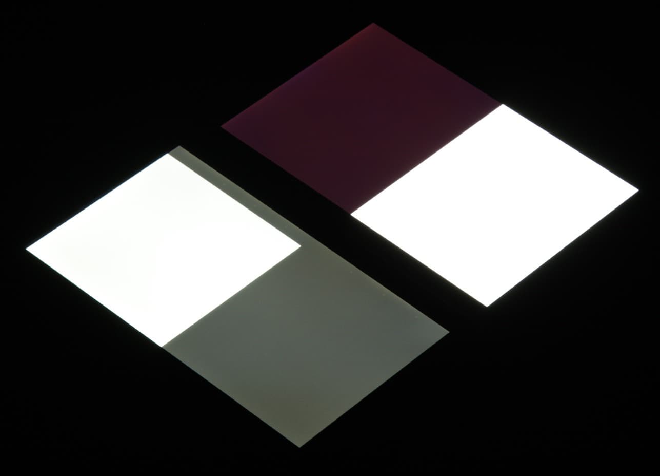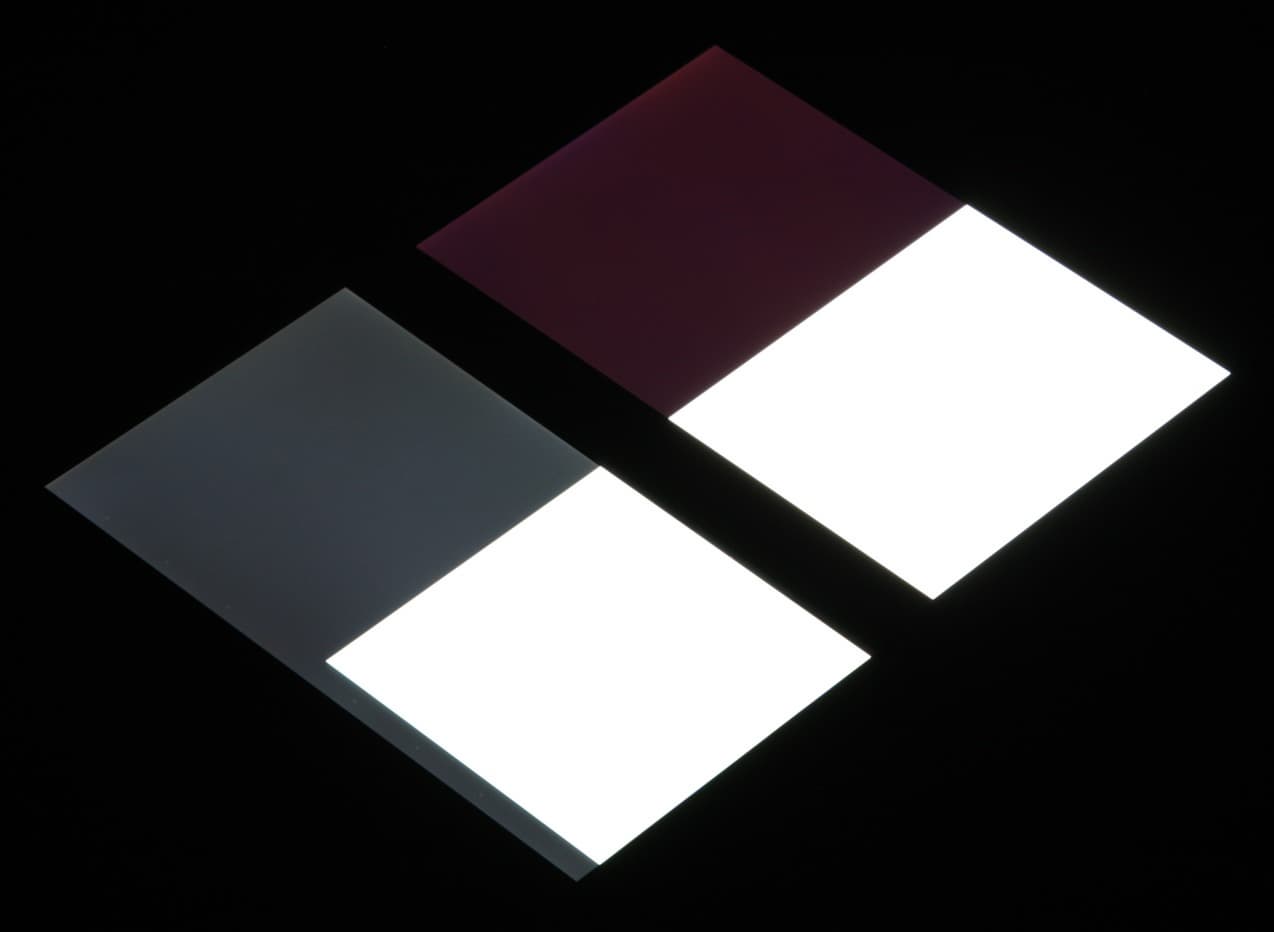 Отметим заметную неравномерность яркости и цветового тона. Теперь под углом примерно 45 градусов к плоскости и к стороне экрана: