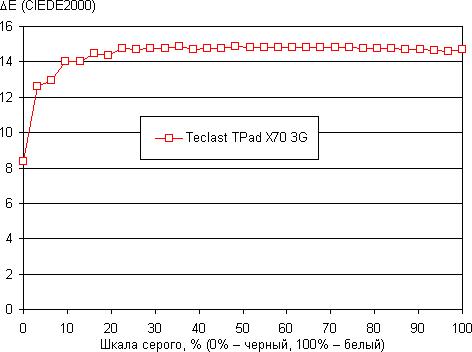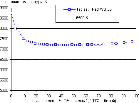 Баланс оттенков на шкале серого компромиссный, так как цветовая температура несильно выше стандартных 6500 К, но отклонение от спектра абсолютно черного тела (ΔE) заметно больше 10, что даже для потребительского устройства считается плохим показателем. Однако при этом вариация цветовой температуры и ΔE небольшая, что положительно сказывается на визуальном восприятии цветового баланса. (Темные области шкалы серого можно не учитывать, так как там баланс цветов не имеет большого значения, да и погрешность измерений цветовых характеристик на низкой яркости большая.)