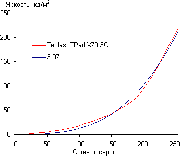 Отметим еще два момента. Во-первых, на полутонах заметно присутствие статичного смешения цветов в виде периодичного узора. Типичные недорогие матрицы неспособны изначально отобразить все градации оттенков даже при 8-битном представлении цвета, поэтому используют динамичное смешение цветов, когда нужный оттенок формируется за счет попеременного вывода ближайших к нему оттенков. Зависит, конечно, от способа такого смешения, но обычно его не очень просто заметить, тогда как статическое смешение, да еще и на матрице низкого разрешения, просто бросается в глаза. И экран данного планшета — как раз такой случай. Во-вторых, изображение на экране этого устройства имеет искаженные пропорции, так как пиксель у данной матрицы не квадратный, а вытянут на 6% вдоль длинной стороны экрана относительно поперечного направления. Но, разумеется, при выводе изображения предполагается квадратный пиксель, и это приводит к соответствующему поперечному сжатию изображения.