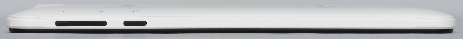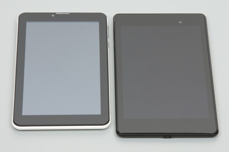Лицевая поверхность экрана выполнена в виде стеклянной пластины с зеркально-гладкой поверхностью, устойчивой к появлению царапин. Судя по яркости отраженных объектов, антибликовые свойства экрана заметно хуже, чем у Google Nexus 7 (2013) (далее просто Nexus 7). Поверхность самой матрицы под стеклом слегка матовая, поэтому экран отражает как прямые источники света (внешней поверхностью), так и рассеянный свет (поверхностью матрицы), это уменьшает читаемость в условиях сильной внешней засветки. Для наглядности приведем фотографию, на которой в выключенных экранах обоих планшетов отражается белая поверхность (Teclast X70 — слева, далее на всех следующих сравнительных фотографиях тестируемый планшет расположен ниже Nexus 7):