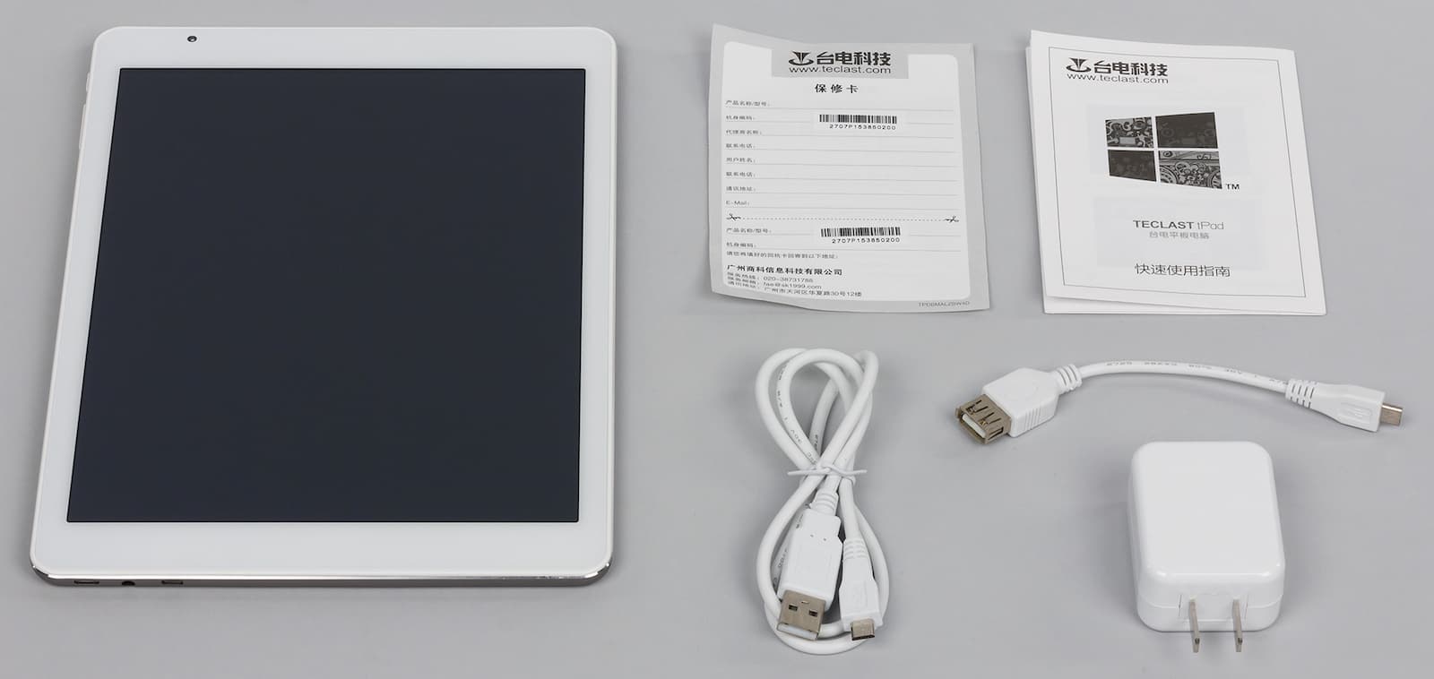 В коробке с планшетом не нашлось ничего особенного: кабели Micro-USB, блок питания (5 В, 2,35 А) без переходника и пара сопроводительных бумажек на китайском.