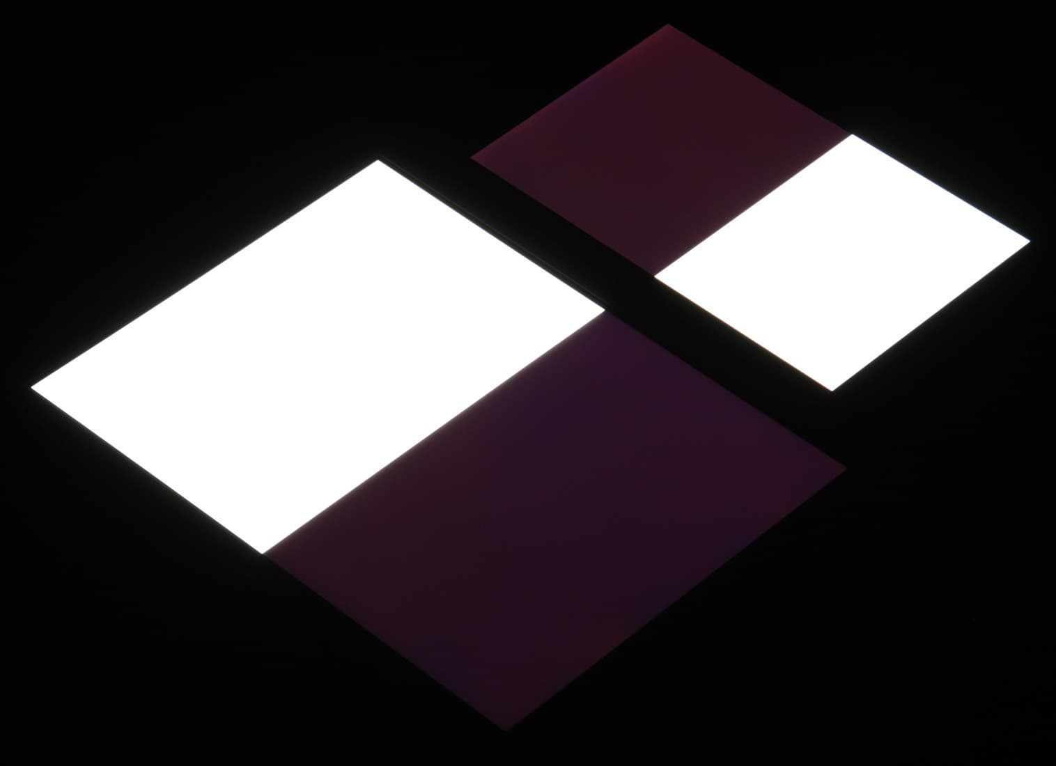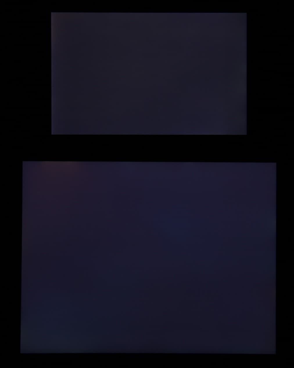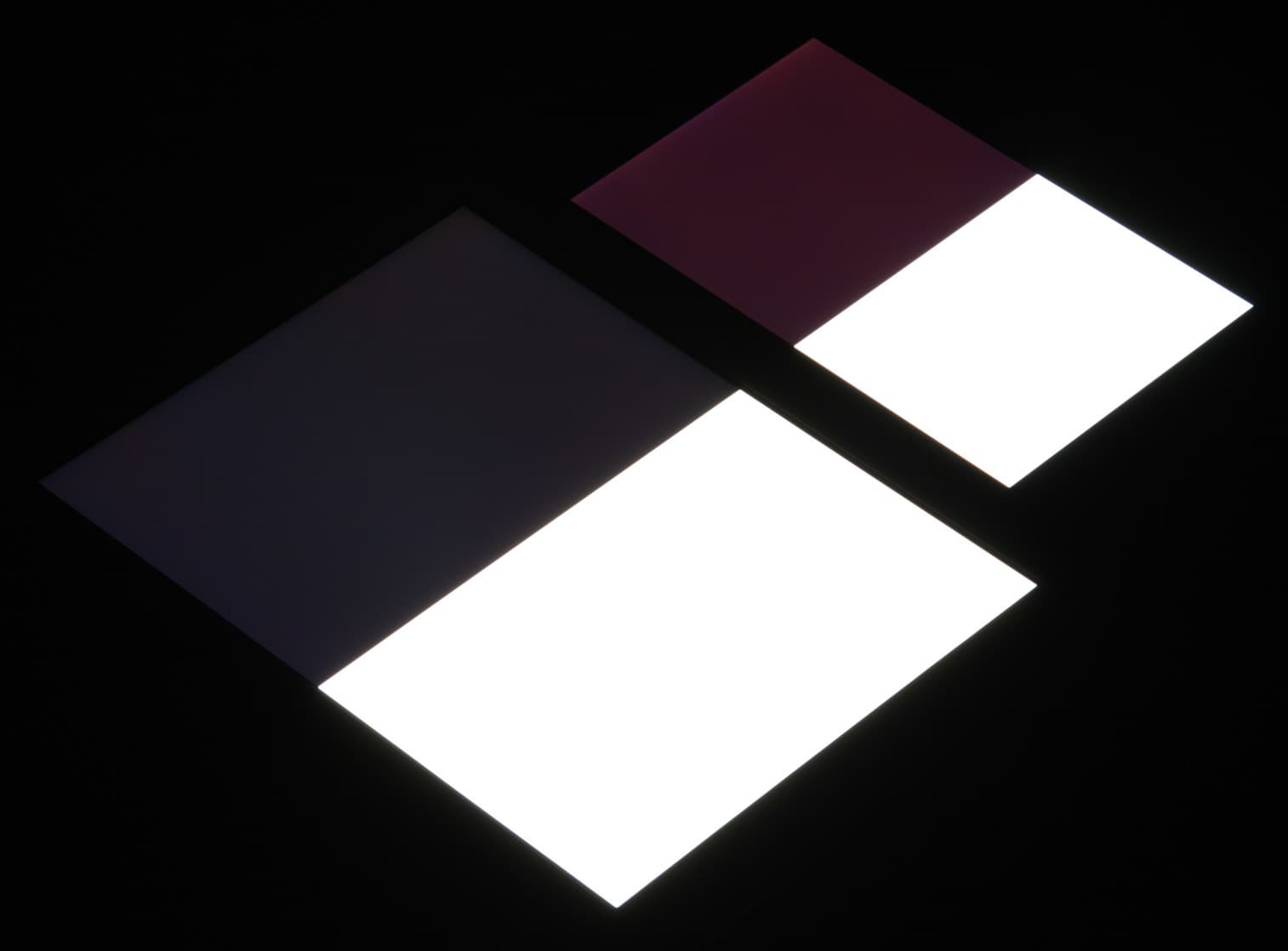 Яркость под углом у обоих планшетов заметно уменьшилась (как минимум в 5 раз, исходя из разницы в выдержке), но в случае Teclast X98 Pro яркость экрана под этим углом немного выше. Черное поле при отклонении по диагонали высветляется слабо и приобретает фиолетовый или красно-фиолетовый оттенок. Фотография с Nexus 7 для сравнения это показывает (яркость белых участков в перпендикулярном направлении у обоих планшетов примерно одинаковая!):