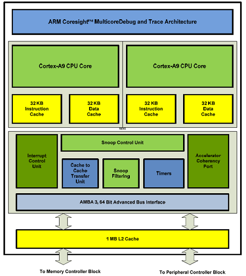 При всём этом, максимальная рабочая частота A9 может превышать 1 ГГц, хотя в первоначальной версии Tegra 2 было выбрано именно это значение. Это очень большой шаг в производительности, по сравнению с предыдущими ядрами ARM. Более высокая частота, сравнительно короткий конвейер и возможность внеочередного выполнения инструкций — всё это даёт огромное преимущество над Cortex-A8 и тем более ARM11. Даже при сравнении одного ядра A8 или ARM11 против одного A9 последний будет явно быстрее, а ведь их два. NVIDIA стала первой компанией, выпустившей SoC на основе двух ядер Cortex-A9, ну а чуть позднее подтянулись и остальные производители.