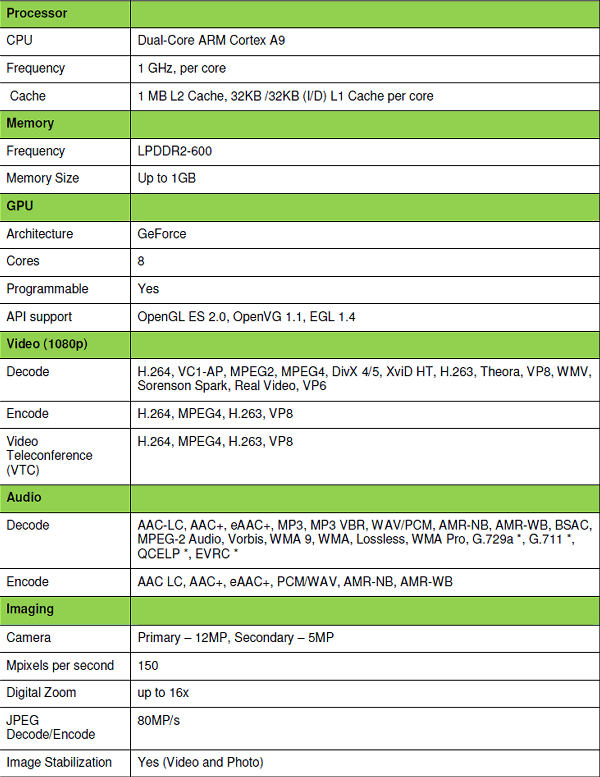 А вот — более подробные технические характеристики второго поколения Tegra, как их представляет компания NVIDIA: