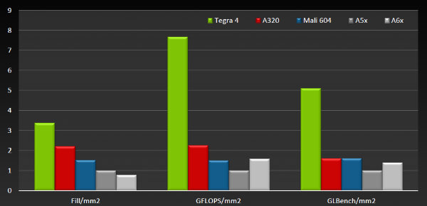 Все площади GPU даны по оценке NVIDIA и приведены (простой нормализацией) к техпроцессу 28 нм. По филлрейту топовое решение NVIDIA несколько уступает лучшему из конкурентов в абсолютных цифрах, но значительно выигрывает в эффективности. Еще бо́льшая разница есть в вычислительной производительности — тут Tegra 4 впереди как в абсолютном зачете, так и по эффективности. Что касается синтетического бенчмарка, то и в нем NVIDIA отмечает большой отрыв своего решения. Все эти цифры гораздо нагляднее выглядят на диаграмме:
