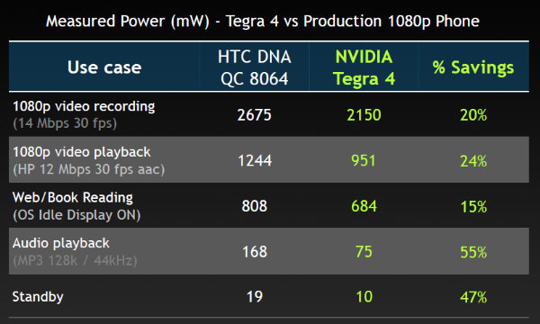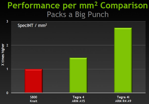 Если Tegra 4 по этому параметру лишь в полтора раза лучше последней версии Qualcomm Krait (по данным NVIDIA), то Cortex-A9 R4 оказывается значительно эффективнее их обоих. Получается, что у NVIDIA есть как наиболее высокопроизводительный чип (Tegra 4), так и самый эффективный (Tegra 4i).