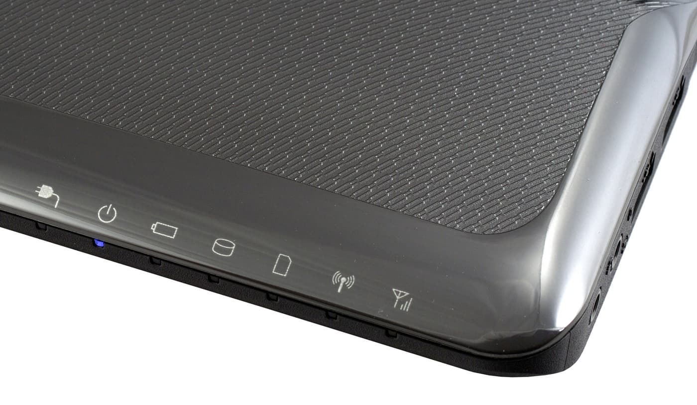 Решение, на мой взгляд, неудачное (хоть и широко распространенное): при работе, чтобы посмотреть на них, надо отклониться назад и убрать правую руку, иначе ничего не видно. Мгновенно оценить состояние системы тоже не получится. Например, в процессе тестирования А660, работавший с блоком питания от более слабой модели, переходил на питание от батарей, и не всегда мне удавалось это увидеть. Индикаторов всего семь: подключение к сети, работа ноутбука (горит белым, когда ноутбук включен, мигает, когда находится в режиме сна), состояние батареи (светится красным, когда батарея заряжается, белым, когда она заряжена, если перейти на работу от батарей, индикатор гаснет и начинает гореть красным только при критическом уровне заряда батарей), индикатор обращения к жесткому диску, индикатор обращения к картоводу, индикатор включения беспроводных интерфейсов (у меня горел красным, когда интерфейс включен), индикатор беспроводных соединений WWAN или WiMAX (возможно).