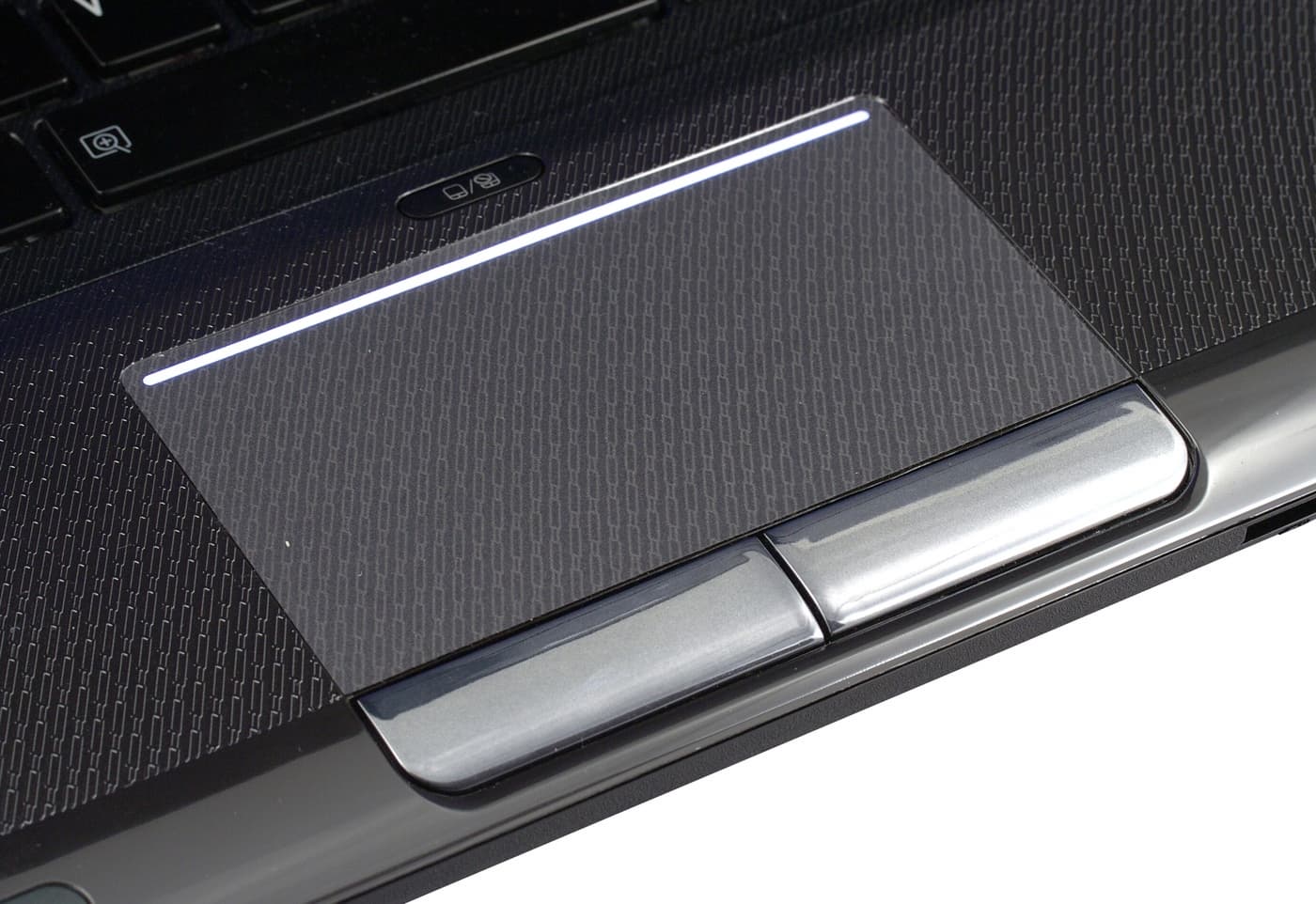 К сожалению, тачпад слишком сильно сдвинут в корпусе влево, поэтому при печати часто задеваешь за него рукой. Это приводит к тому, что курсор скачет и меняется место, где печатается текст, что делает быструю печать (да и печать вообще) практически невозможной. Теоретически, можно отрегулировать чувствительность тачпада, однако у меня максимум получилось сделать так, чтобы курсор не нажимался (хотя стрелка все равно постоянно ездила туда-сюда). Впрочем, тачпад можно легко отключить, и не только сочетанием с Fn, но и отдельной кнопкой, расположенной над ним. Наконец, стоит отметить, что над тачпадом есть традиционная для Toshiba светящаяся полоска, благодаря которой легче находить тачпад в темноте.