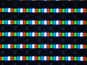Нетипичным является то, что к триаде из красного, зеленого и синего субпикселей добавлен белый субпиксель. Такое решение позволяет увеличить яркость белого поля без увеличения затрат на подсветку. Конечно, волшебства не получается, и побочные эффекты присутствуют: яркость цветного изображения при этом непропорционально ниже яркости белых участков. Это, видимо, отчасти компенсируется динамической регулировкой яркости, но в целом прием с белым субпикселем является неким трюком, как, например, и введение прозрачного сегмента в светофильтры офисных DLP-проекторов.