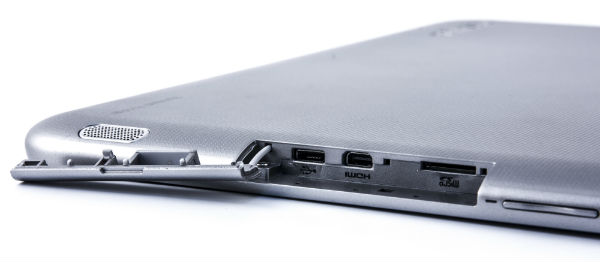 Грани планшета имеют легкое скругление. Расположение разъемов и кнопок — традиционное: почти все они разместились на левой грани. Там можно обнаружить комбинированный аудиоразъем 3,5 мм для наушников и микрофона, качельку регулировки громкости, разъем для подключения зарядного устройства, а также слот microSD, разъемы Micro-USB (с поддержкой OTG) и Micro-HDMI. Причем последние три защищены крышечкой.