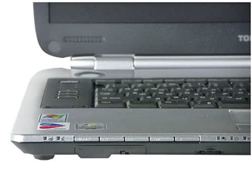 Итак, для начала давайте рассмотрим расположение разъемов. На передней панели не так уж много портов: ИК порт (вот уж чего вполне можно было бы избежать), механический выключатель беспроводной связи, традиционный для Toshiba регулятор громкости в виде колесика, да вынесенные на торец кнопки управления аудиоплеером. Тут нужно отметить, что передняя панель скошена к низу почти под 45 градусов, поэтому пользоваться, например, регулировкой громкости очень и очень неудобно — более-менее толстый палец элементарно застревает между поверхностью стола и скосом, и не достает до регулировки.