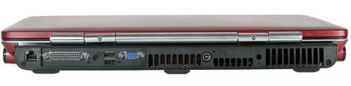 Большая часть задней панели отдана под решетки системы вентиляции. Это и понятно: с такой начинкой потребуется серьёзная вентиляция. Среди решеток находится разъем для штекера питания. В левой части расположены разъемы: слева сетевой разъем, далее порт LPT, два слота USB 2.0, расположенные один над другим, выход на внешний монитор.