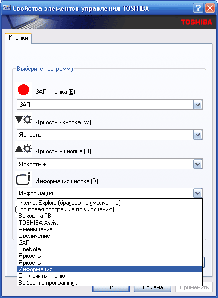 - CD/DVD — запуск ПО для воспроизведения аудио-CD или видео-DVD дисков. При отключенном питании запускается Qosmio Player, при включенном — Windows Media Player или WinDVD.