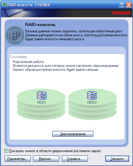Что касается фирменных утилит, то они объединены оболочкой Toshiba Assist (скриншоты 1,2,3). В комплект входят, пожалуй, уже стандартно для ноутбуков, утилита управления энергопотреблением Toshiba Power Saver и утилита Toshiba ConfeegFree, упрощающая конфигурирование ноутбука при подключении к проводным и беспроводным сетям. Кроме этого, присутствует и утилита управления параметрами зеркалирования (конфигурация RAID-массива задается в BIOS).