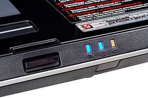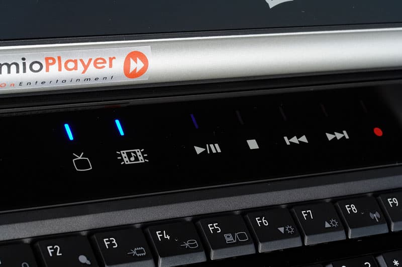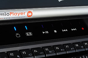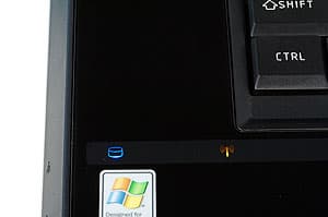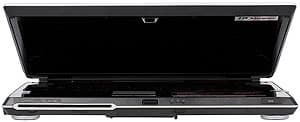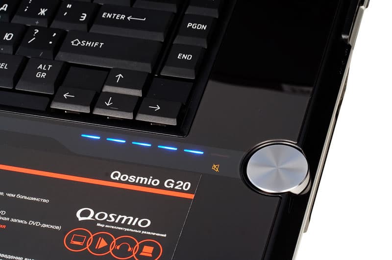 При открытой крышке ноутбук выглядит весьма эффектно, я бы даже сказал, аристократично. Кнопка включения, большая рукоятка регулировки громкости и…все. Остальные кнопки (а их не много ни мало 11) — сенсорные. Индикаторы при выключенном ноутбуке ничем себя не проявляют, вызывая ассоциации с панелью приборов Optitron от Toyota. Включаем ноутбук и получаем… нет, слава богу, не рождественскую елку. Индикаторы смотрятся достаточно строго, в чем вы можете убедиться ниже. Правда, блестящий полированный пластик панели имее тенденцию быстро покрываться отпечатками пальцев. Так что входящая в комплект салфетка окажется весьма кстати.