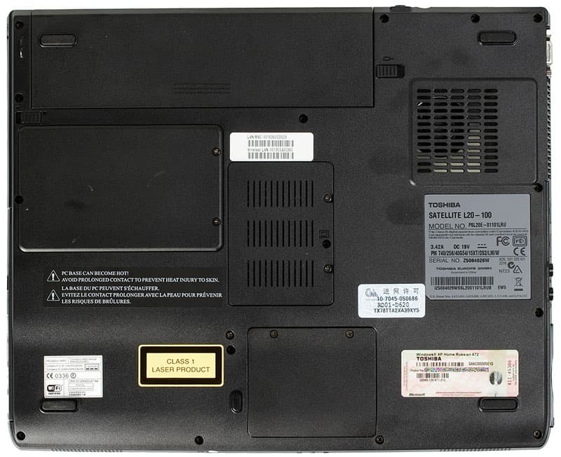 На нижней крышке — отсеки модулей памяти (по центру), жесткого диска (слева под батареей) и платы беспроводной сети (внизу).