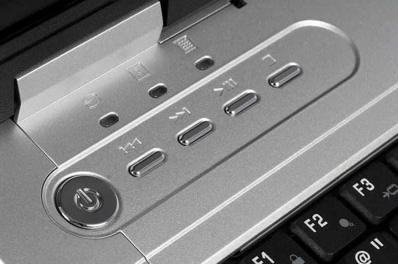 Слева над клавиатурой — кнопка включения питания, блок кнопок управления воспроизведением аудио/видео и индикаторы активности устройств хранения и Lock`ов.