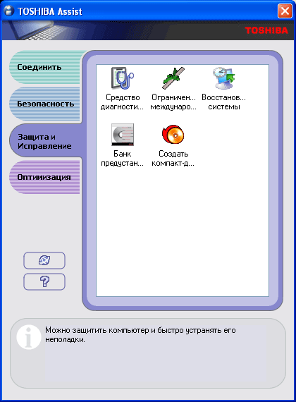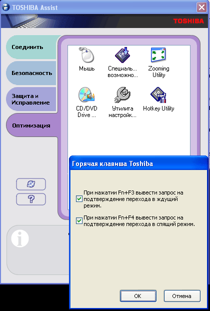 Фирменные утилиты Toshiba присутствуют, хотя и в сильно урезанном объеме (см. скриншот1, скриншот2, скриншот3, скриншот4). Позабавила Hotkey Utility (скриншот4) — я сначала не понял, что можно настраивать при полном отсутствии клавиш быстрого доступа. Оказывается, вывод подтверждения при переводе ноутбука в спящий и ждущий режимы :). А почему в комплект не вошел Toshiba Power Saver — непонятно. Видимо, по той же причине, по которой отсутствовали драйвера беспроводной сети.