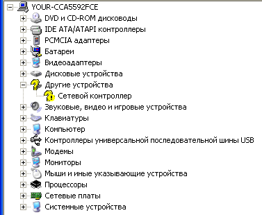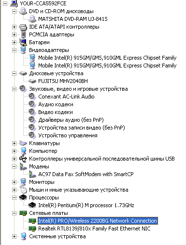 За счет чего достигается дешевизна "начинки" — понятно. Платформа Intel Centrino предыдущего поколения, встроенная графика, минимум памяти, матрица с небольшим разрешением, жесткий диск малой емкости, отсутствие картовода. Из "приятностей" — только пишущий DVD привод с поддержкой записи двухслойных дисков. Что неприятно поразило — у "продажного" ноутбука не был установлен драйвер беспроводного сетевого адаптера (см. скриншот). Пришлось устанавливать самостоятельно. Не лучший вариант, учитывая, что такие ноутбуки часто покупают люди, весьма слабо разбирающиеся в компьютерной технике.