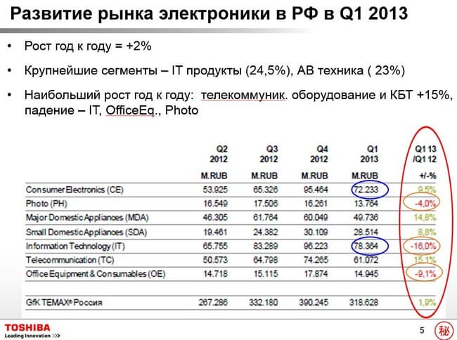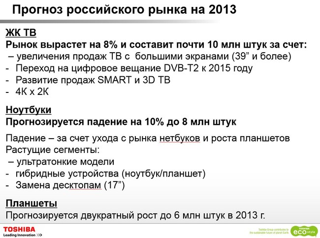 Ключевыми компонентами стратегии компании Toshiba на рынке в 2013 году будут: